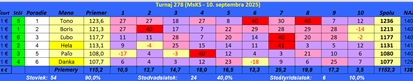 Malá účasť, ale pomerne veľa dobrých výsledkov. Inak asi žiadne mimoriadne prekvapenia, každý zahral svoj štandard. Až na to, že prvýkrát v tomto roku máme iného víťaza, než sme zvyknutí! Potešiteľné je, že aj Ľubo je vysoko - v základe skončil druhý a vo finálovej časti prekonal víťaza = získal bronz. Z dvojice žien tentokrát vyšla víťazne Hela a má 7 trpaslíkov (teda víťazstiev)...