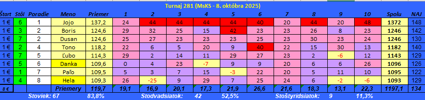 Dnes to teda bolo prekvapenie asi pre všetkých - neuveriteľná účasť - prišlo nás 18! Takže sme odohrali dokonca aj neoficiálnu 3. ligu. V nej sa stretli dvaja Milanovia a po nekonečne dlhom súboji (9 zápasov) vyhral ten mladší.V základnej úžasne začal a dlho aj užasne pokračoval Jojo, bohužiaľ v dvoch kolách pred koncom svoju štyridsiatkovú sériu porušil, aby to uzavrel poslednou štyridsaťosmičkou. My ďalší sme zostali ďaleko za ním. Ženskú ligu vyhrala opäť Hela a v osemčlennej dvojke sa najlepšie darilo Paľovi. Vo finále prekvapenia pokračovali - najskôr Boris vyradil Joja a zrazu bolo adeptov na víťaza niekoľko... Málokto však čakal, že nakoniec sa bude smiať skoro nováčik Johnny! A navyše ktovie kedy sa zase ukáže... hádam ani on! Kiež by nás takto veľa chodilo častejšie...